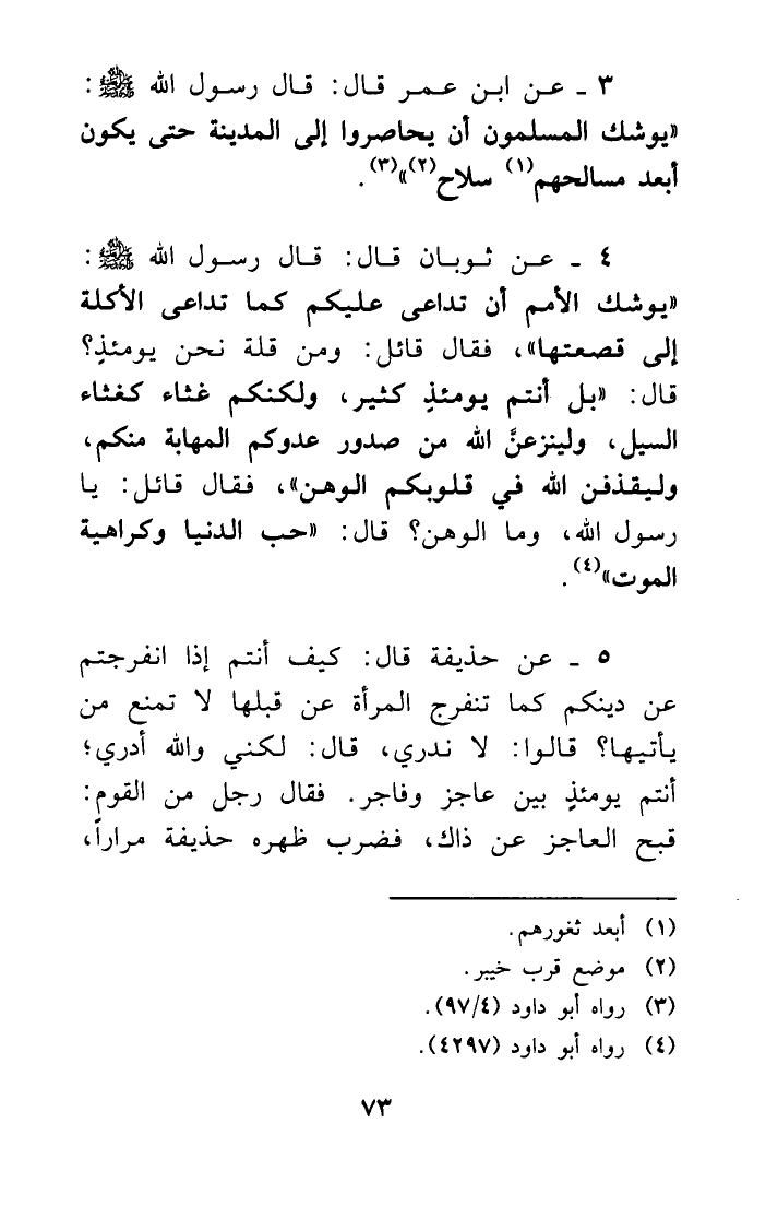 4- عن ثوبان قال: قال رسول الله - صلى الله عليه وسلم -: ((يوشك الأمم أن تداعى عليكم كما تداعى الأكلة إلى قصعتها، فقال قائل: ومن قلة نحن يومئذٍ؟ قال: بل أنتم يومئذٍ كثير، ولكنكم غثاء كغثاء السيل، ولينزعنَّ الله من صدور عدوكم المهابة منكم، وليقذفن الله في قلوبكم الوهن، فقال قائل: يا رسول الله وما الوهن؟ قال: حب الدنيا وكراهية الموت)) (¬4) .