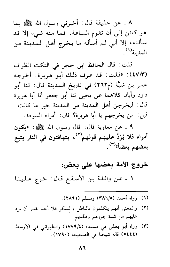 8- عن حذيفة قال: أخبرني رسول الله - صلى الله عليه وسلم - بما هو كائن إلى أن تقوم الساعة، فما منه شيء إلا قد سألته، إلا أني لم أسأله ما يخرج أهل المدينة من المدينة (¬1) .
