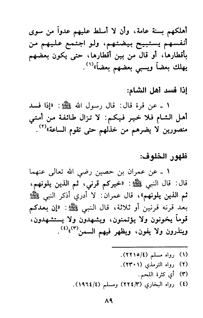 1- عن عمران بن حصين رضي الله تعالى عنهما قال: قال النبي - صلى الله عليه وسلم -: ((خيركم قرني، ثم الذين يلونهم، ثم الذين يلونهم، قال عمران: لا أدري أذكر النبي - صلى الله عليه وسلم - بعد قرنه قرنين أو ثلاثة، قال النبي - صلى الله عليه وسلم -: ((إن بعدكم قوماً يخونون ولا يؤتمنون، ويشهدون ولا يستشهدون، وينذرون ولا يفون، ويظهر فيهم السمن (¬3)) ) (¬4) .