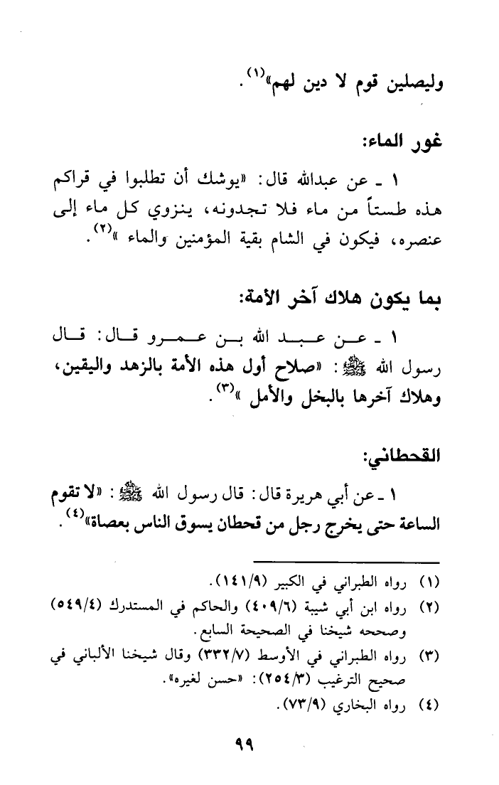 1- عن عبد الله قال: ((يوشك أن تطلبوا في قراكم هذه طستاً من ماء فلا تجدونه، ينزوي كل ماء إلى عنصره، فيكون في الشام بقية المؤمنين والماء)) (¬2) .
