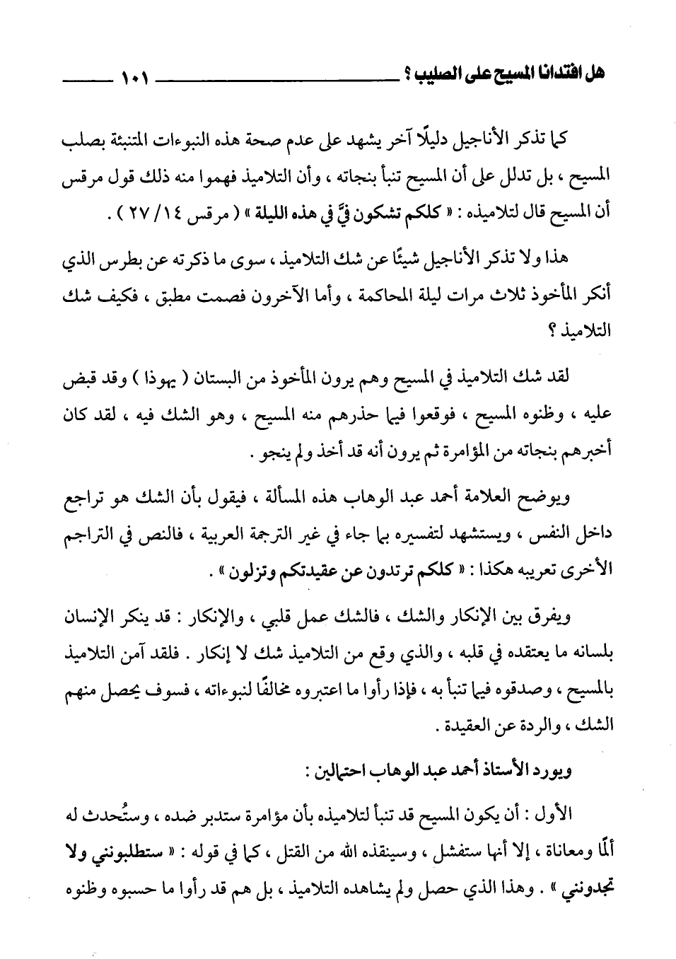 ويفرق بين الإنكار والشك، فالشك عمل قلبي، والإنكار: قد ينكر الإنسان بلسانه ما يعتقده في قلبه، والذي وقع من التلاميذ شك لا إنكار. فلقد آمن التلاميذ بالمسيح، وصدقوه فيما تنبأ به، فإذا رأوا ما اعتبروه مخالفاً لنبوءاته، فسوف يحصل منهم الشك، والردة عن العقيدة.