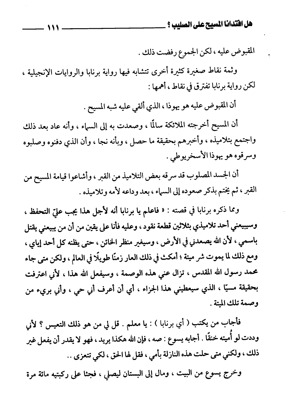 فأجاب من يكتب (أي برنابا): يا معلم. قل لي من هو ذلك التعيس؟ لأني وددت لو أُميته خنقاً. أجابه يسوع: صه، فإن الله هكذا يريد، فهو لا يقدر أن يفعل غير ذلك، ولكني متى حلت هذه النازلة بأمي، فقل لها الحق، لكي تتعزى ...