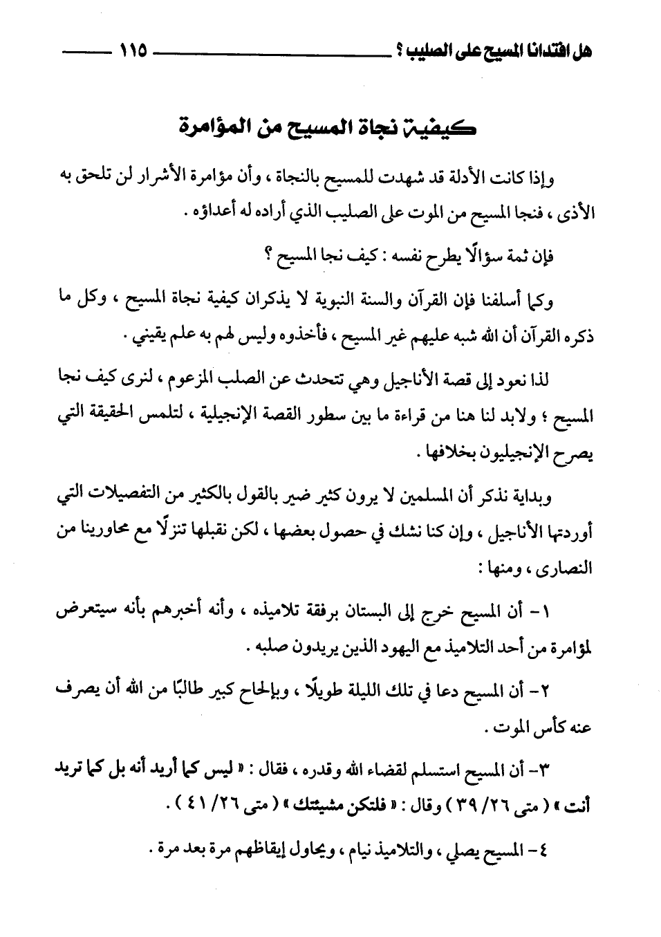 3) أن المسيح استسلم لقضاء الله وقدره، فقال: " ليس كما أريد أنه بل كما تريد أنت " (متى 26/ 39) وقال: " فلتكن مشيئتك" (متى 26/ 41).