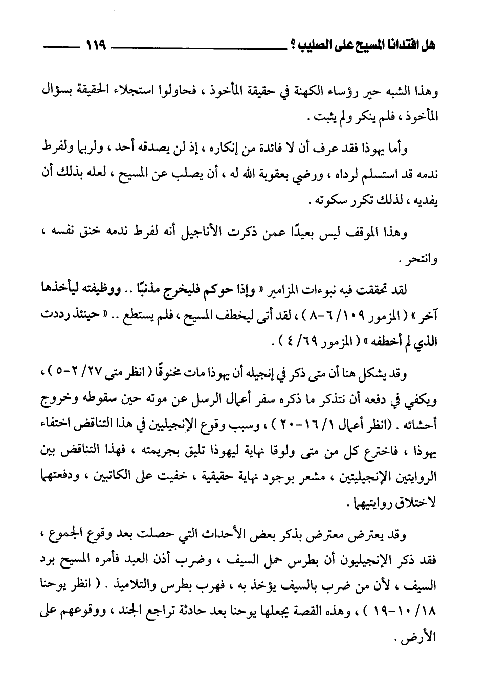 وقد يشكل هنا أن متى ذكر في إنجيله أن يهوذا مات مخنوقاً (انظر متى 27/ 2 - 5)، ويكفي في دفعه أن نتذكر ما ذكره سفر أعمال الرسل عن موته حين سقوطه وخروج أحشائه. (انظر أعمال 1/ 16 - 20)، وسبب وقوع الإنجيليين في هذا التناقض اختفاء يهوذا، فاخترع كل من متى ولوقا نهاية ليهوذا تليق بجريمته، فهذا التناقض بين الروايتين الإنجيليتين، مشعر بوجود نهاية حقيقية، خفيت على الكاتبين، ودفعتهما لاختلاق روايتيهما.