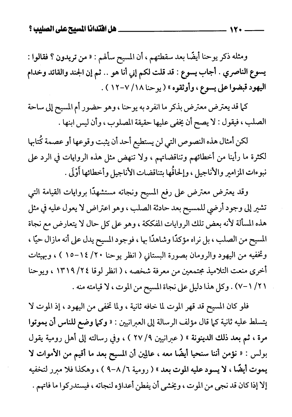 فلو كان المسيح قد قهر الموت لما خافه ثانية، ولما تخفى من اليهود، إذ الموت لا يتسلط عليه ثانية كما قال مؤلف الرسالة إلى العبرانيين: " وكما وضع للناس أن يموتوا مرة، ثم بعد ذلك الدينونة " (عبرانيين 9/ 27)، وفي رسالته إلى أهل رومية يقول بولس: " المسيح بعد ما أقيم من الأموات لا يموت أيضاً، لا يسود عليه الموت بعد " (رومية 6/ 8 - 9)، وهكذا فلا مبرر لتخفيه إلا إذا كان قد نجى من الموت، ويخشى أن يفطن أعداؤه لنجاته، فيستدركوا ما فاتهم.