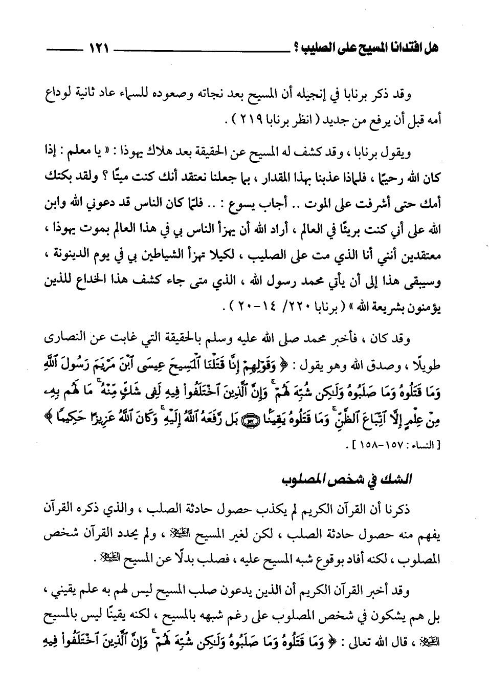 ذكرنا أن القرآن الكريم لم يكذب حصول حادثة الصلب، والذي ذكره القرآن يفهم منه حصول حادثة الصلب، لكن لغير المسيح عليه السلام، ولم يحدد القرآن شخص المصلوب، لكنه أفاد بوقوع شبه المسيح عليه، فصلب بدلاً عن المسيح عليه السلام.