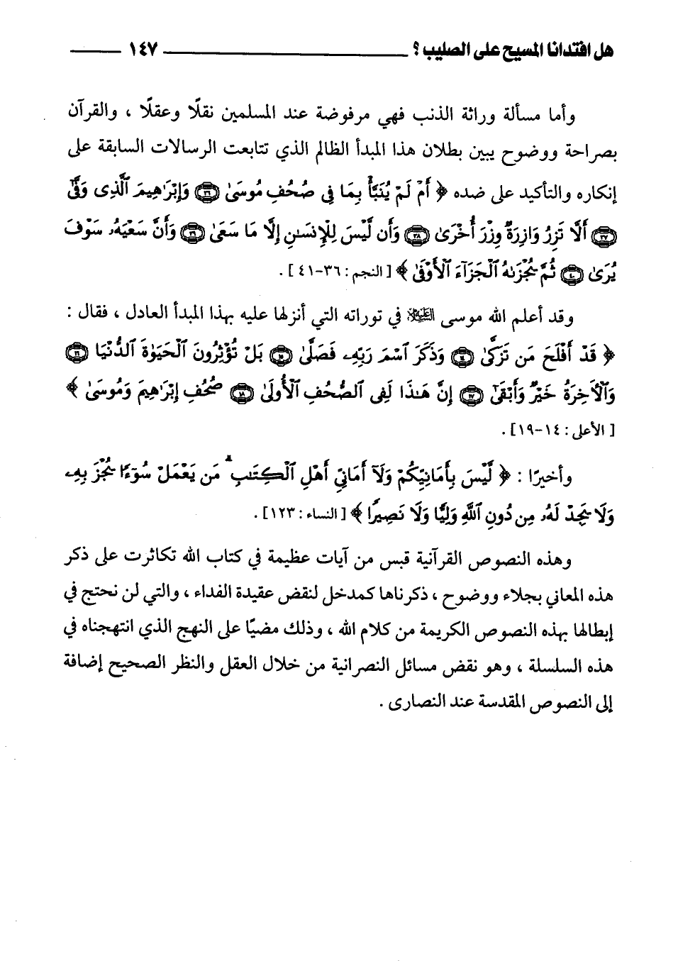 وهذه النصوص القرآنية قبس من آيات عظيمة في كتاب الله تكاثرت على ذكر هذه المعاني بجلاء ووضوح، ذكرناها كمدخل لنقض عقيدة الفداء، والتي لن نحتج في إبطالها بهذه النصوص الكريمة من كلام الله، وذلك مضياً على النهج الذي انتهجناه في هذه السلسلة، وهو نقض مسائل النصرانية من خلال العقل والنظر الصحيح إضافة إلى النصوص المقدسة عند النصارى.