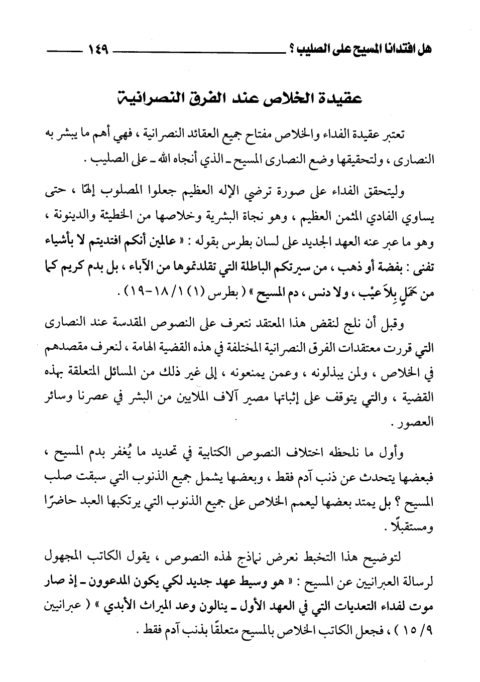 وقبل أن نلج لنقض هذا المعتقد نتعرف على النصوص المقدسة عند النصارى التي قررت معتقدات الفرق النصرانية المختلفة في هذه القضية الهامة، لنعرف مقصدهم في الخلاص، ولمن يبذلونه، وعمن يمنعونه، إلى غير ذلك من المسائل المتعلقة بهذه القضية، والتي يتوقف على إثباتها مصير آلاف الملايين من البشر في عصرنا وسائر العصور.