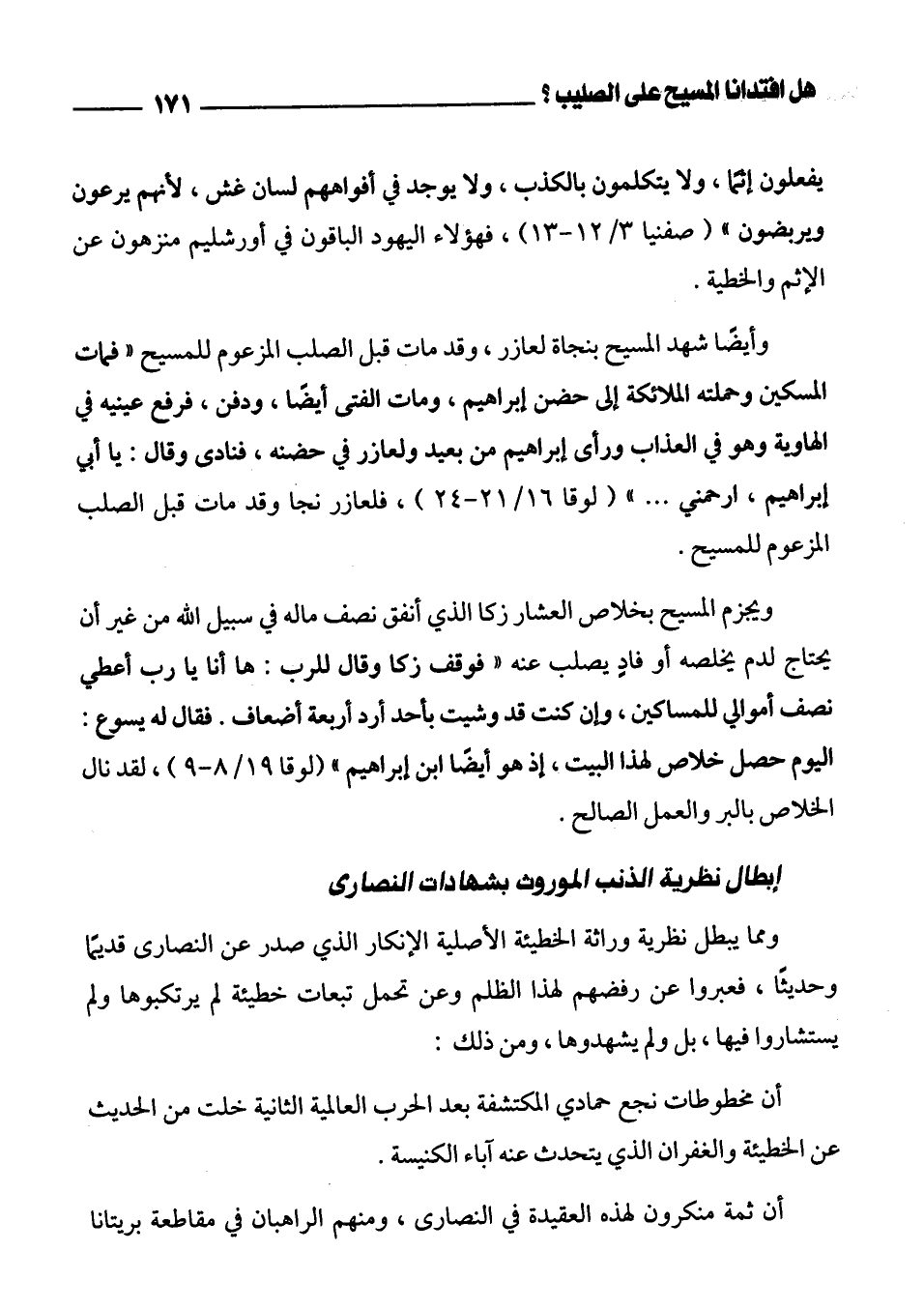وأيضاً شهد المسيح بنجاة لعازر، وقد مات قبل الصلب المزعوم للمسيح " فمات المسكين وحملته الملائكة إلى حضن إبراهيم، ومات الفتى أيضاً، ودفن، فرفع عينيه في الهاوية وهو في العذاب ورأى إبراهيم من بعيد ولعازر في حضنه، فنادى وقال: يا أبي إبراهيم، ارحمني .... " (لوقا 16/ 21 - 24)، فلعازر نجا وقد مات قبل الصلب المزعوم للمسيح.