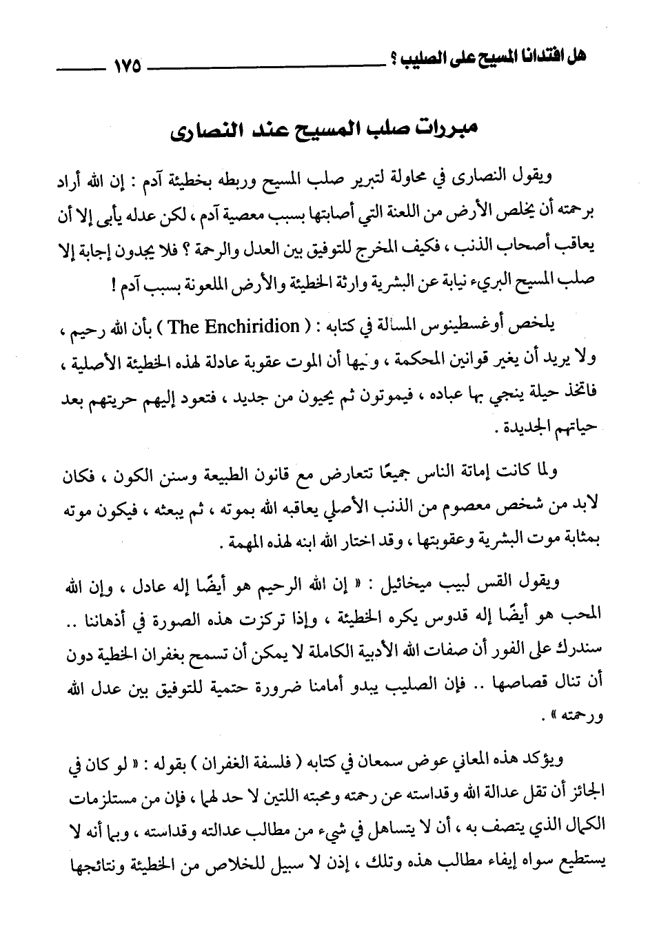 ويؤكد هذه المعاني عوض سمعان في كتابه " فلسفة الغفران " بقوله: " لو كان في الجائز أن تقل عدالة الله وقداسته عن رحمته ومحبته اللتين لا حد لهما، فإن من مستلزمات الكمال الذي يتصف به، أن لا يتساهل في شيء من مطالب عدالته وقداسته، وبما أنه لا يستطيع سواه إيفاء مطالب هذه وتلك، إذن لا سبيل للخلاص من الخطيئة ونتائجها