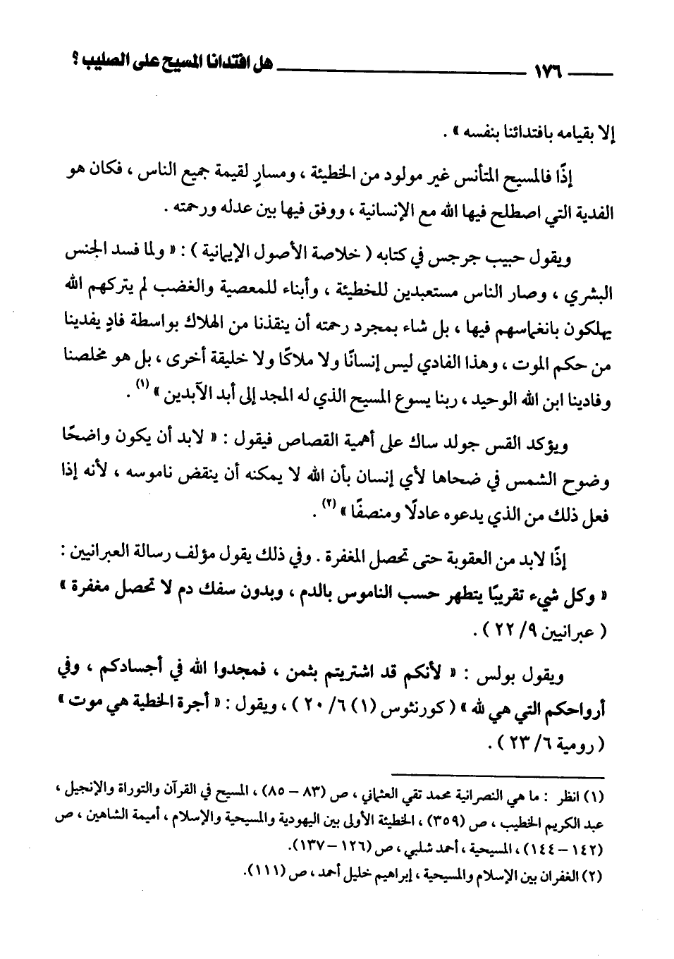 (¬1) انظر: ما هي النصرانية محمد تقي العثماني، ص (83 - 85)، المسيح في القرآن والتوراة والإنجيل، عبد الكريم الخطيب، ص (359)، الخطيئة الأولى بين اليهودية والمسيحية والإسلام، أميمة الشاهين، ص (142 - 144)، المسيحية، أحمد شلبي، ص (126 - 137).