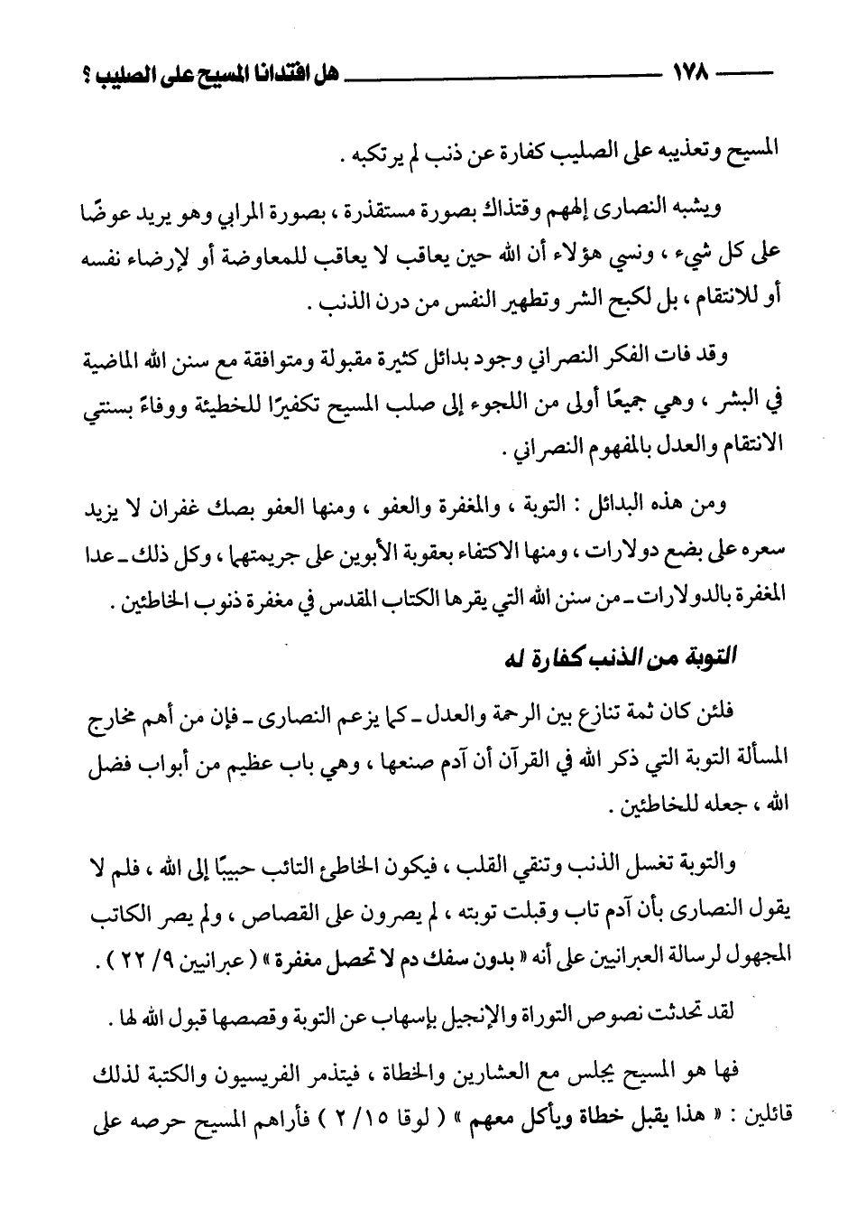 والتوبة تغسل الذنب وتنقي القلب، فيكون الخاطئ التائب حبيباً إلى الله، فلم لا يقول النصارى بأن آدم تاب وقبلت توبته، لم يصرون على القصاص، ولم يصر الكاتب المجهول لرسالة العبرانيين على أنه " بدون سفك دم لا تحصل مغفرة" (عبرانيين 9/ 22).