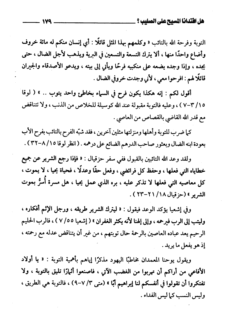 أقول لكم: إنه هكذا يكون فرح في السماء بخاطئ واحد يتوب ... " (لوقا 15/ 3 - 7)، وعليه فالتوبة مقبولة عند الله كوسيلة للخلاص من الذنب، ولا تتناقض مع قدر الله القاضي بالقصاص من العاصي.