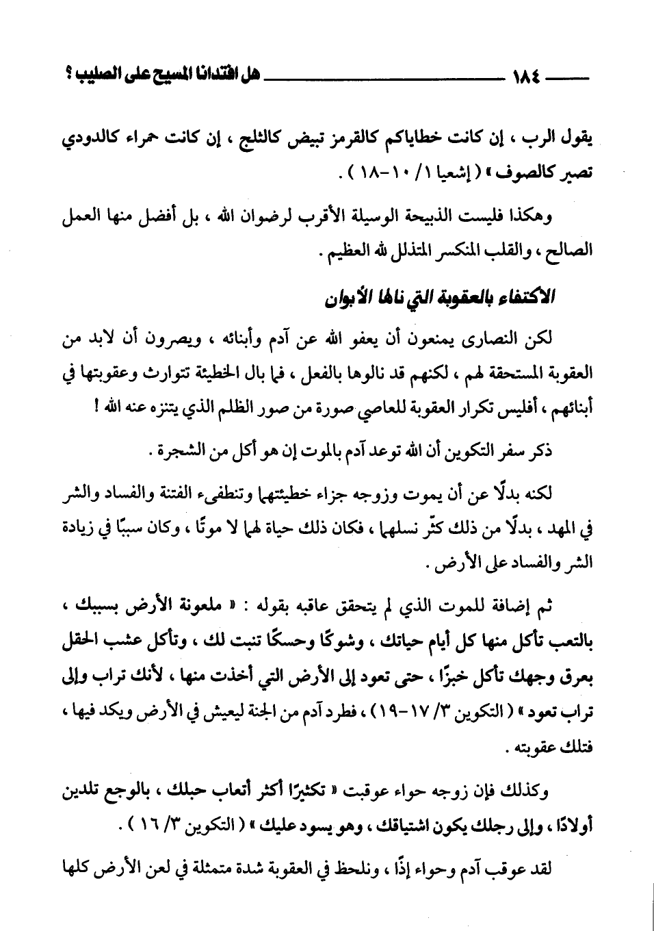 لكن النصارى يمنعون أن يعفو الله عن آدم وأبنائه، ويصرون أن لابد من العقوبة المستحقة لهم، لكنهم قد نالوها بالفعل، فما بال الخطيئة تتوارث وعقوبتها في أبنائهم، أفليس تكرار العقوبة للعاصي صورة من صور الظلم الذي يتنزه عنه الله!