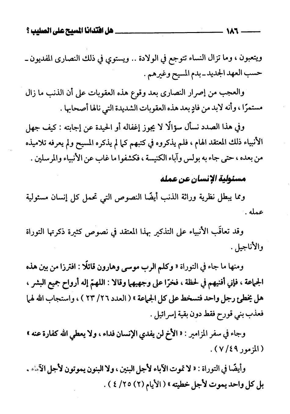 وأيضاً في التوراة: " لا تموت الآباء لأجل البنين، ولا البنون يموتون لأجل الآباء، بل كل واحد يموت لأجل خطيته " (الأيام (2) 25/ 4).