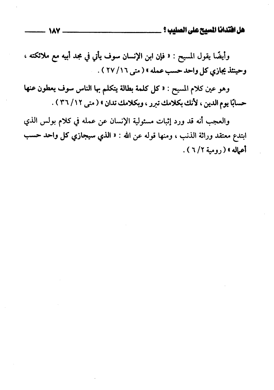 والعجب أنه قد ورد إثبات مسئولية الإنسان عن عمله في كلام بولس الذي ابتدع معتقد وراثة الذنب، ومنها قوله عن الله: " الذي سيجازي كل واحد حسب أعماله " (رومية 2/ 6).