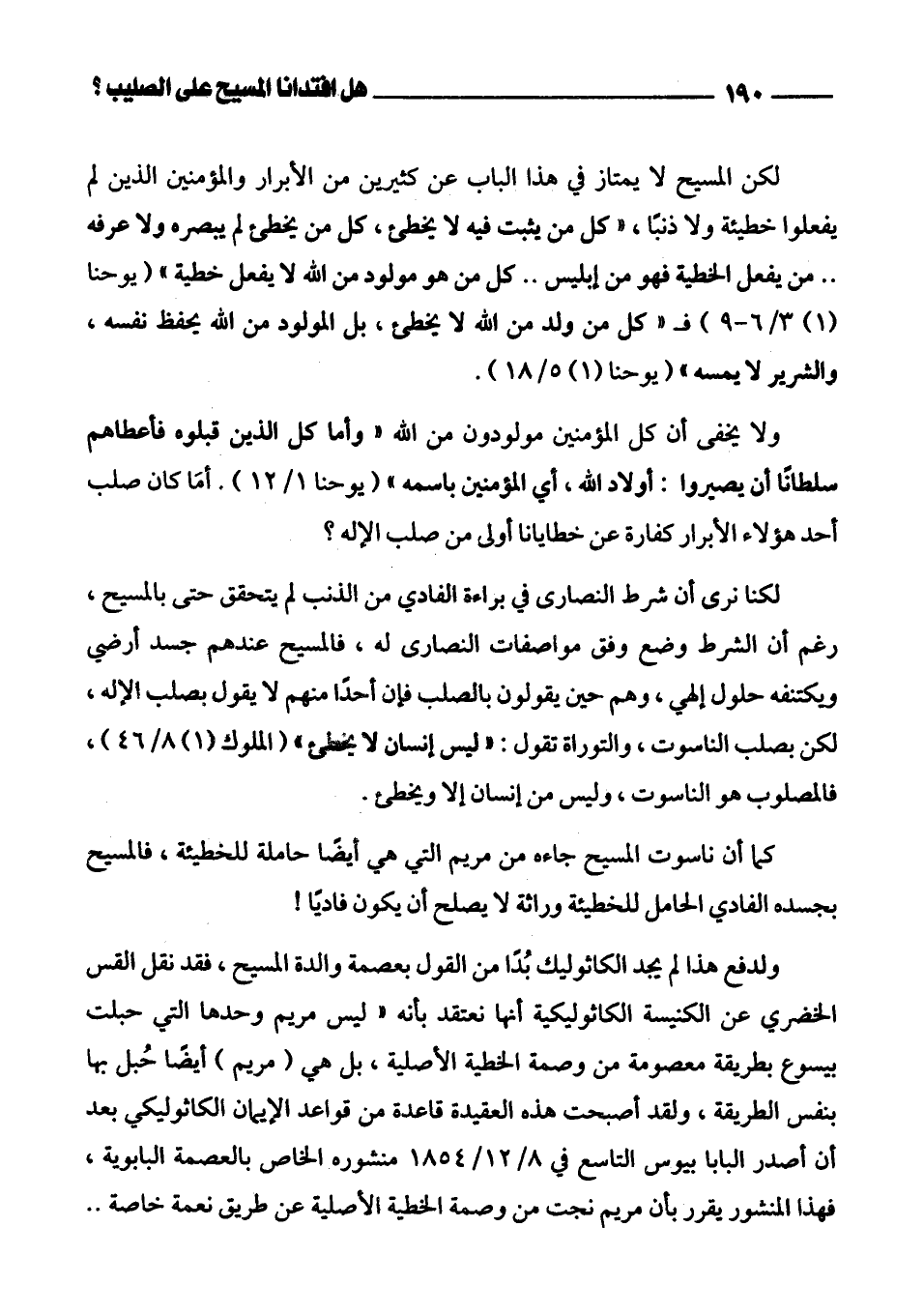 ولا يخفى أن كل المؤمنين مولودون من الله "وأما كل الذين قبلوه فأعطاهم سلطاناً أن يصيروا: أولاد الله، أي المؤمنين باسمه" (يوحنا 1/ 12). أمَا كان صلب أحد هؤلاء الأبرار كفارة عن خطايانا أولى من صلب الإله؟