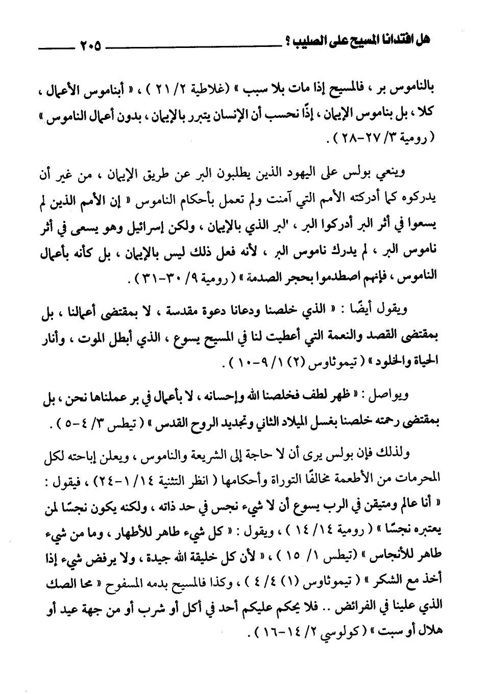 بالناموس بر، فالمسيح إذا مات بلا سبب " (غلاطية 2/ 21)، " أبناموس الأعمال، كلا، بل بناموس الإيمان، إذاً نحسب أن الإنسان يتبرر بالإيمان، بدون أعمال الناموس " (رومية 3/ 27 - 28).