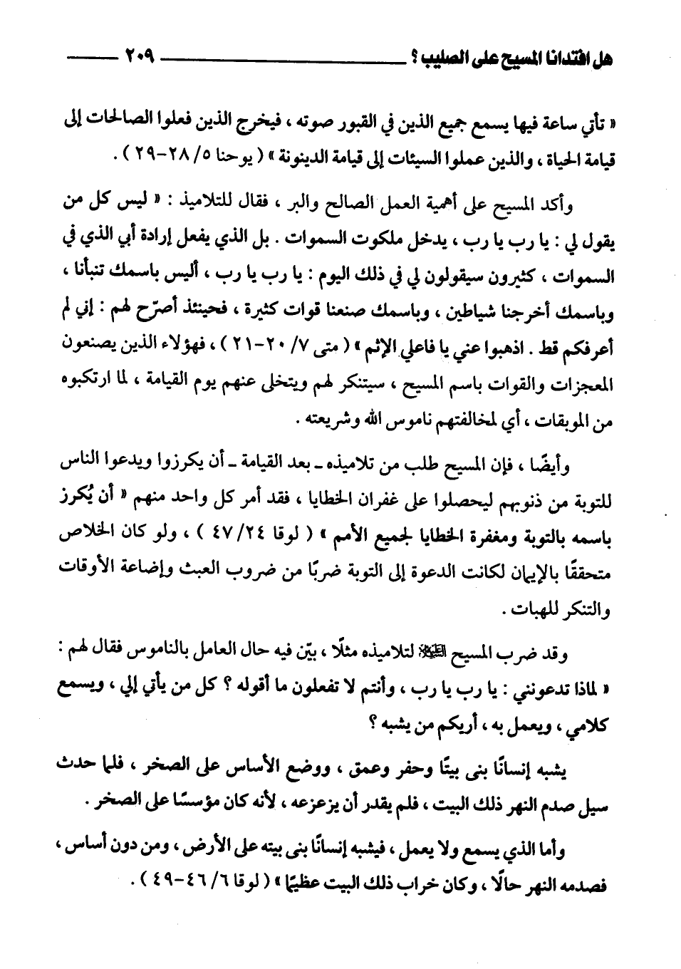 وقد ضرب المسيح عليه السلام لتلاميذه مثلاً، بيّن فيه حال العامل بالناموس فقال لهم: "لماذا تدعونني: يا رب يا رب، وأنتم لا تفعلون ما أقوله؟ كل من يأتي إلي، ويسمع كلامي، ويعمل به، أريكم من يشبه؟