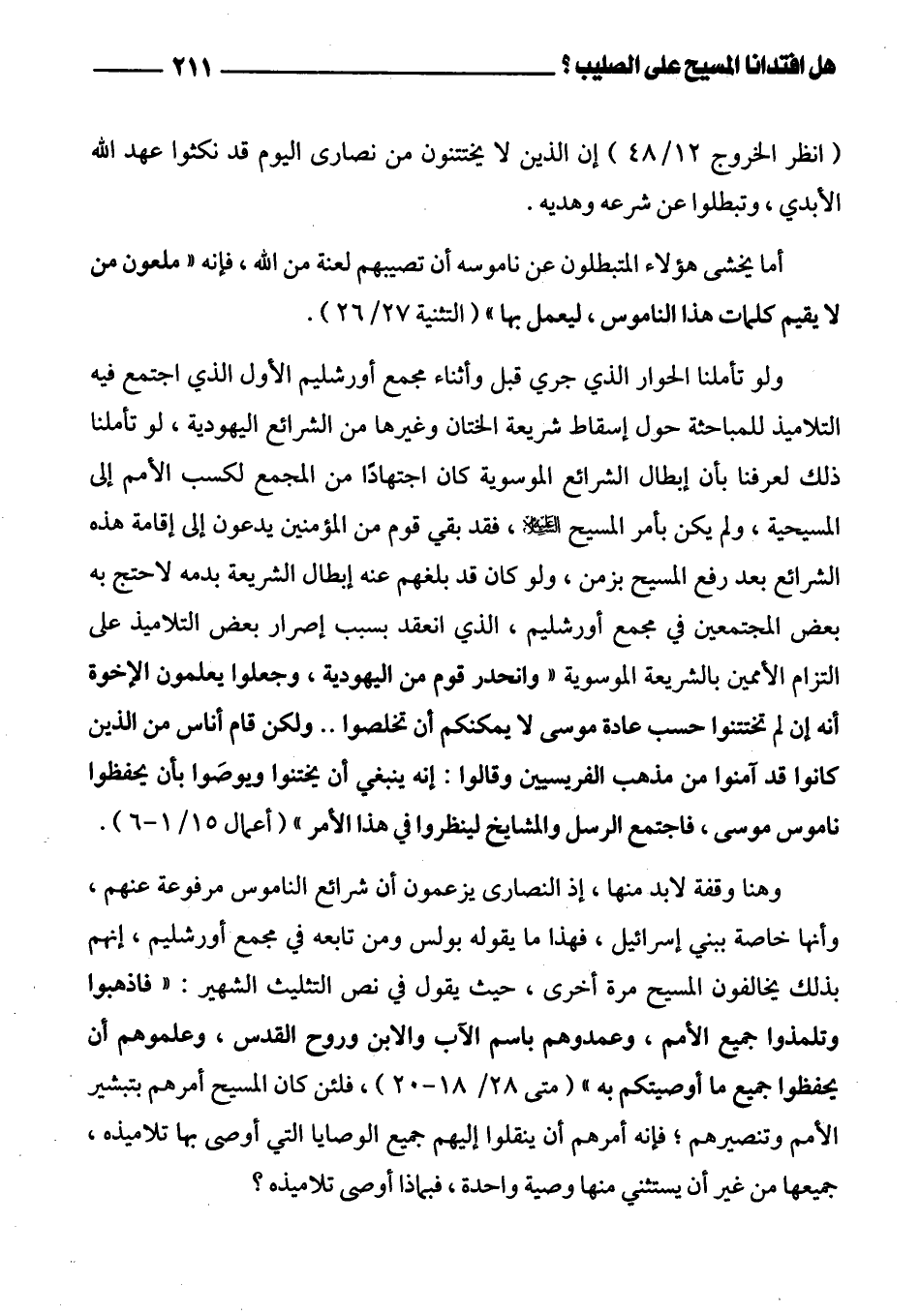 ولو تأملنا الحوار الذي جري قبل وأثناء مجمع أورشليم الأول الذي اجتمع فيه التلاميذ للمباحثة حول إسقاط شريعة الختان وغيرها من الشرائع اليهودية، لو تأملنا ذلك لعرفنا بأن إبطال الشرائع الموسوية كان اجتهاداً من المجمع لكسب الأمم إلى المسيحية، ولم يكن بأمر المسيح عليه السلام، فقد بقي قوم من المؤمنين يدعون إلى إقامة هذه الشرائع بعد رفع المسيح بزمن، ولو كان قد بلغهم عنه إبطال الشريعة بدمه لاحتج به بعض المجتمعين في مجمع أورشليم، الذي انعقد بسبب إصرار بعض التلاميذ على التزام الأممين بالشريعة الموسوية "وانحدر قوم من اليهودية، وجعلوا يعلمون الإخوة أنه إن لم تختتنوا حسب عادة موسى لا يمكنكم أن تخلصوا .. ولكن قام أناس من الذين كانوا قد آمنوا من مذهب الفريسيين وقالوا: إنه ينبغي أن يختنوا ويوصَوا بأن يحفظوا ناموس موسى، فاجتمع الرسل والمشايخ لينظروا في هذا الأمر" (أعمال 15/ 1 - 6).