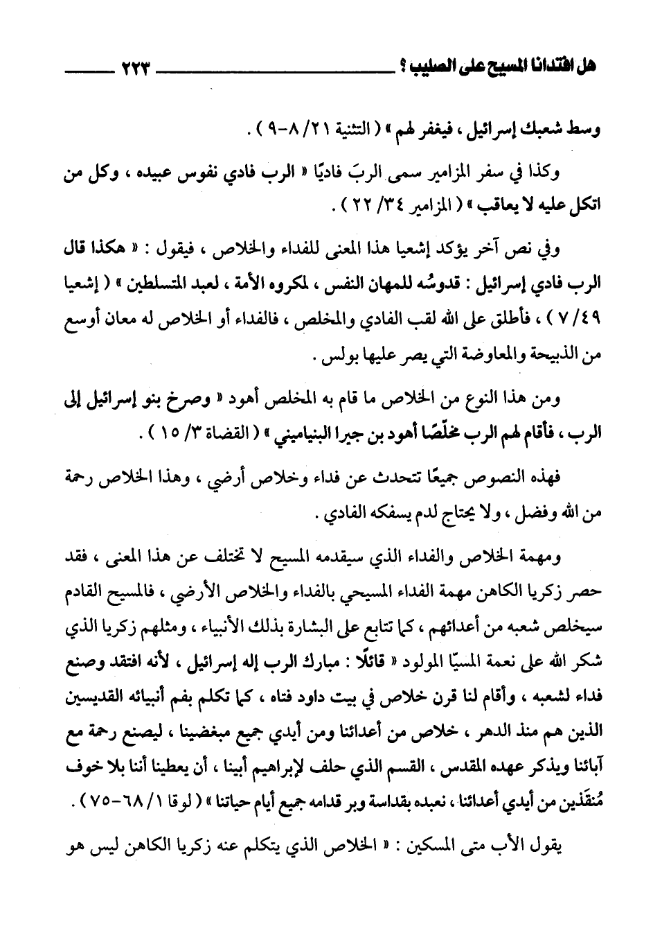 وفي نص آخر يؤكد إشعيا هذا المعنى للفداء والخلاص، فيقول: " هكذا قال الرب فادي إسرائيل: قدوسُه للمهان النفس، لمكروه الأمة، لعبد المتسلطين" (إشعيا 49/ 7)، فأطلق على الله لقب الفادي والمخلص، فالفداء أو الخلاص له معان أوسع من الذبيحة والمعاوضة التي يصر عليها بولس.