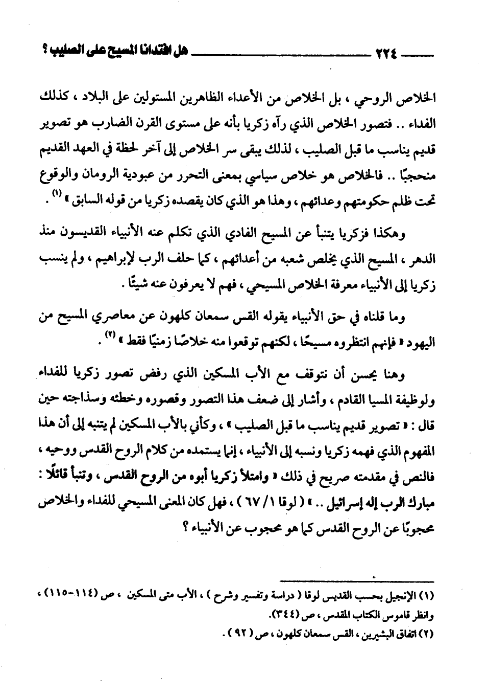 وما قلناه في حق الأنبياء يقوله القس سمعان كلهون عن معاصري المسيح من اليهود "فإنهم انتظروه مسيحاً، لكنهم توقعوا منه خلاصاً زمنياً فقط". (¬2)