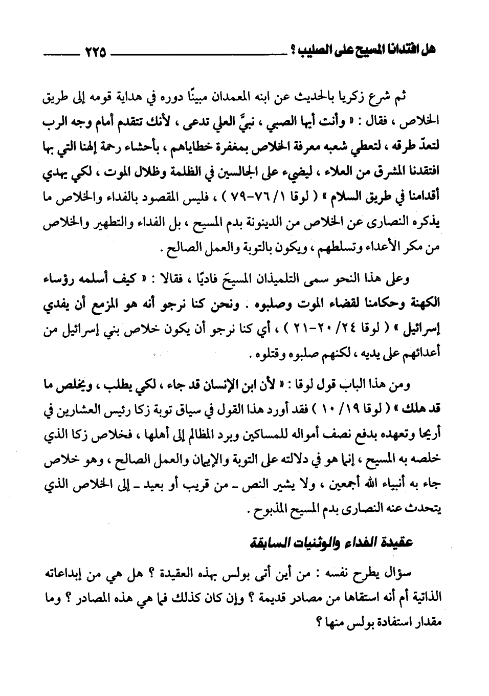 ومن هذا الباب قول لوقا: «لأن ابن الإنسان قد جاء، لكي يطلب، ويخلص ما قد هلك» (لوقا 19/ 10)، وهو قول يتعلق به النصارى القائلون بأن المسيح جاء ليخلصنا بدمه المسفوح على خشبات الصليب، لكن النص يتحدث عن خلاص وقع لزكا رئيس العشارين في أريحا حين تاب وتعهد بدفع نصف أمواله للمساكين ورد المظالم إلى أهلها «فقال له يسوع: اليوم حصل خلاص لهذا البيت؛ إذ هو أيضًا ابن إبراهيم، لأن ابن الإنسان قد جاء، لكي يطلب، ويخلص ما قد هلك» (لوقا 19/ 9 - 10)، فالمسيح خلَّص زكا حين أرشده إلى التوبة والإيمان والعمل الصالح، وهو خلاص جاء به أنبياء الله أجمعين، ولا يشير النص ـ من قريب أو بعيد ـ إلى الخلاص الذي يتحدث عنه النصارى بدم المسيح المذبوح.