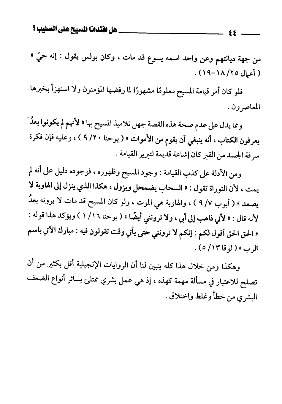 ومن الأدلة على كذب القيامة: وجود المسيح وظهوره، فوجوده دليل على أنه لم يمت، لأن التوراة تقول: " السحاب يضمحل ويزول، هكذا الذي ينزل إلى الهاوية لا يصعد " (أيوب 7/ 9)، والهاوية هي الموت، ولو كان المسيح قد مات لا يرونه بعدُ لأنه قال: " لأني ذاهب إلى أبي، ولا ترونني أيضاً " (يوحنا 16/ 1) ويؤكد هذا قوله: "الحق الحق أقول لكم: إنكم لا ترونني حتى يأتي وقت تقولون فيه: مبارك الآتي باسم الرب" (لوقا 13/ 5).