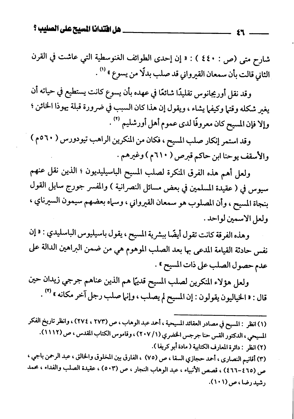 ولعل هؤلاء المنكرين لصلب المسيح قديماً هم الذين عناهم جرجي زيدان حين قال: " الخياليون يقولون: إن المسيح لم يصلب، وإنما صلب رجل آخر مكانه ". (¬3)