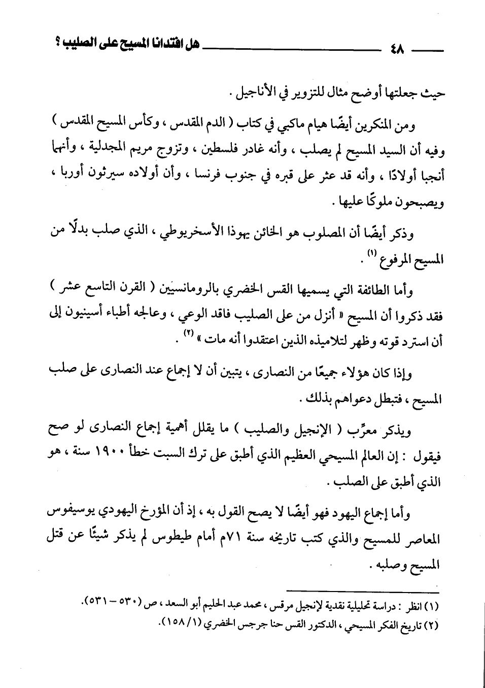 وأما إجماع اليهود فهو أيضاً لا يصح القول به، إذ أن المؤرخ اليهودي يوسيفوس المعاصر للمسيح والذي كتب تاريخه سنة 71م أمام طيطوس لم يذكر شيئاً عن قتل المسيح وصلبه.