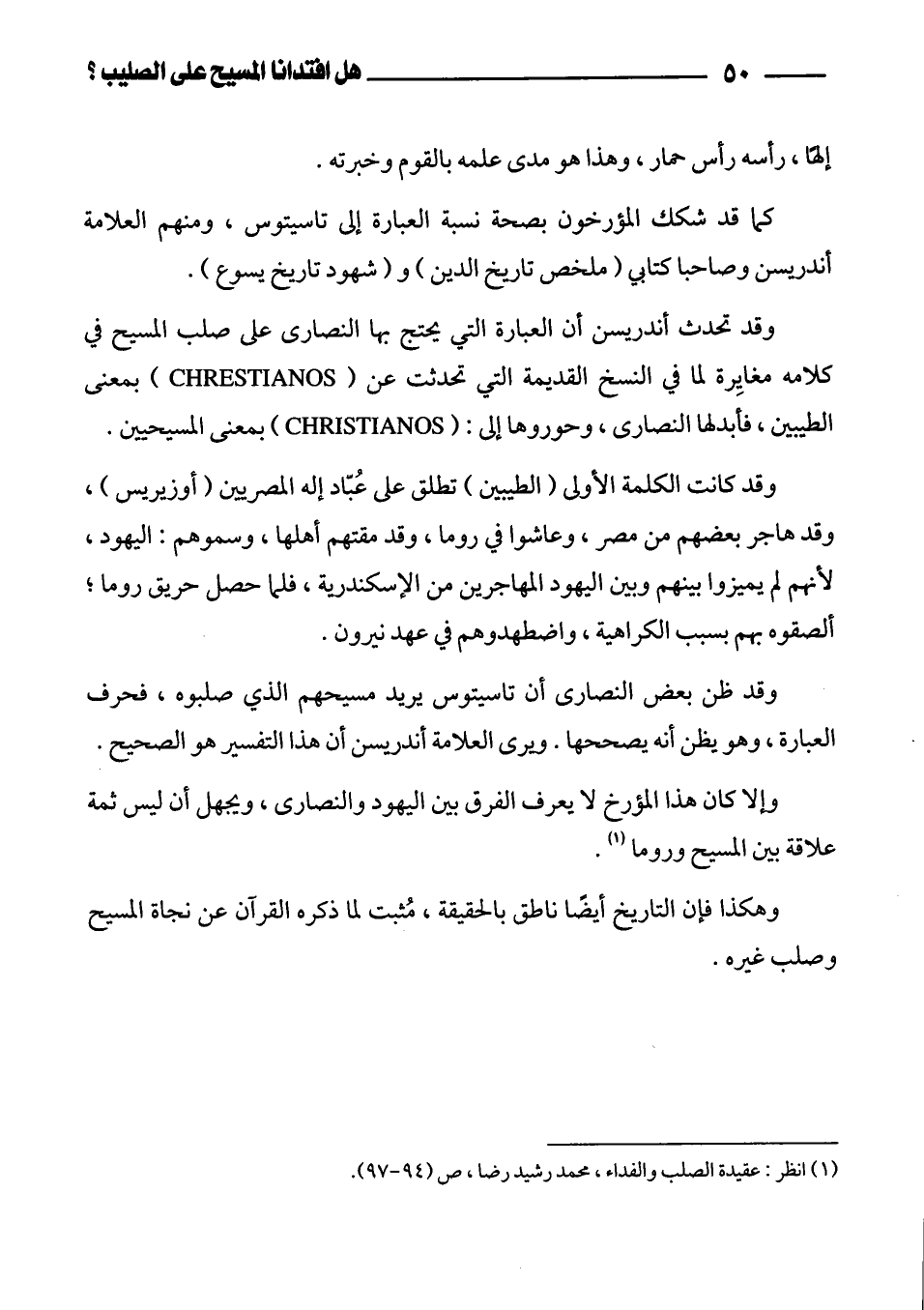 (¬1) انظر: عقيدة الصلب والفداء، محمد رشيد رضا، ص (94 - 97) وموت أم إغماء؟ د. فريز صموئيل، ص (80).