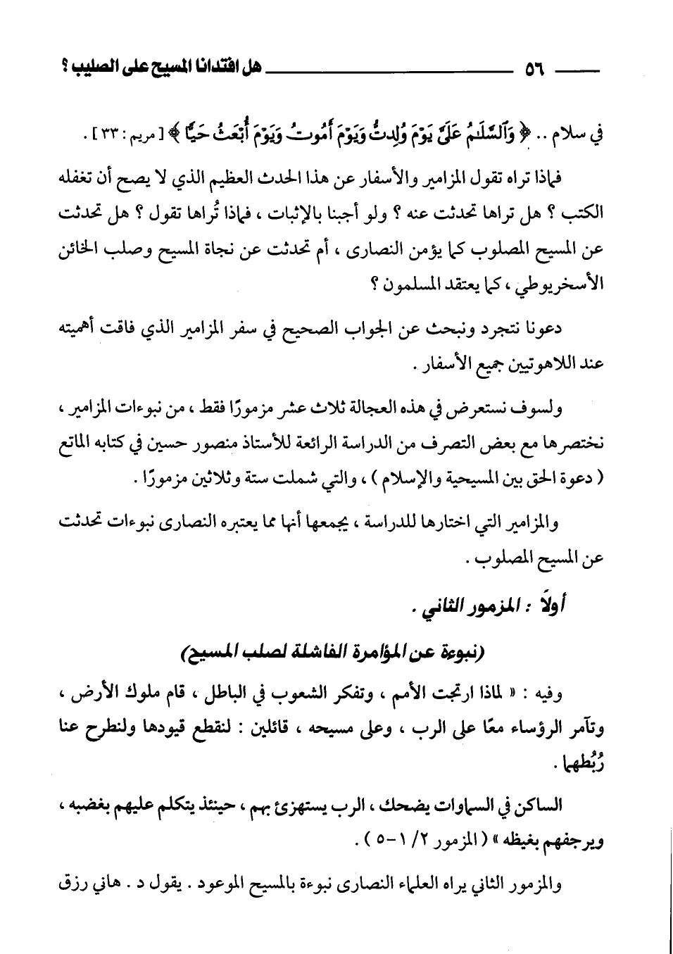 فماذا تراه تقول المزامير والأسفار عن هذا الحدث العظيم الذي لا يصح أن تغفله الكتب؟ هل تراها تحدثت عنه؟ ولو أجبنا بالإثبات، فماذا تُراها تقول؟ هل تحدثت عن المسيح المصلوب كما يؤمن النصارى، أم تحدثت عن نجاة المسيح وصلب الخائن الأسخريوطي، كما يعتقد المسلمون؟