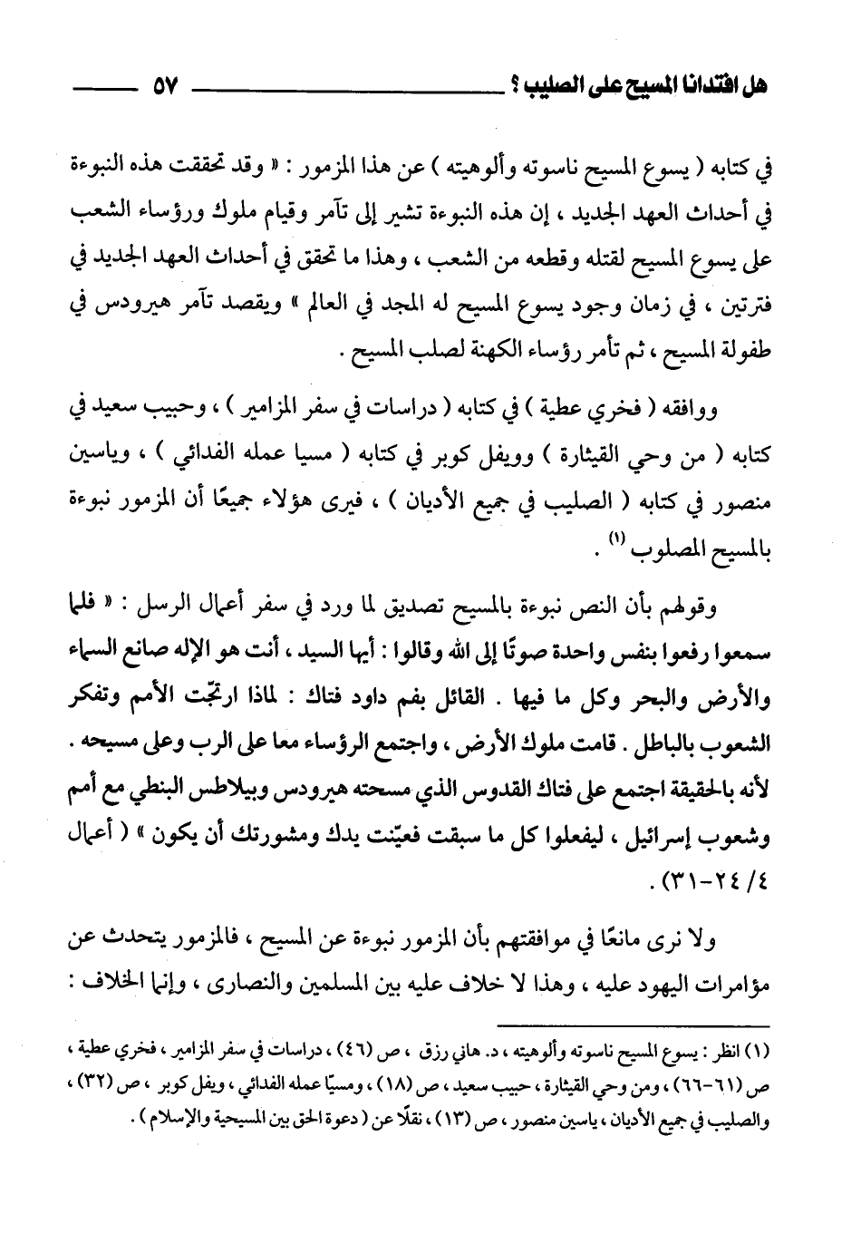 (¬1) انظر: يسوع المسيح ناسوته وألوهيته، د. هاني رزق، ص (46)، دراسات في سفر المزامير، فخري عطية، ص (61 - 66)، ومن وحي القيثارة، حبيب سعيد، ص (18)، ومسيّا عمله الفدائي، ويفل كوبر، ص (32)، والصليب في جميع الأديان، يسّى منصور، ص (13)، نقلاً عن "دعوة الحق بين المسيحية والإسلام".