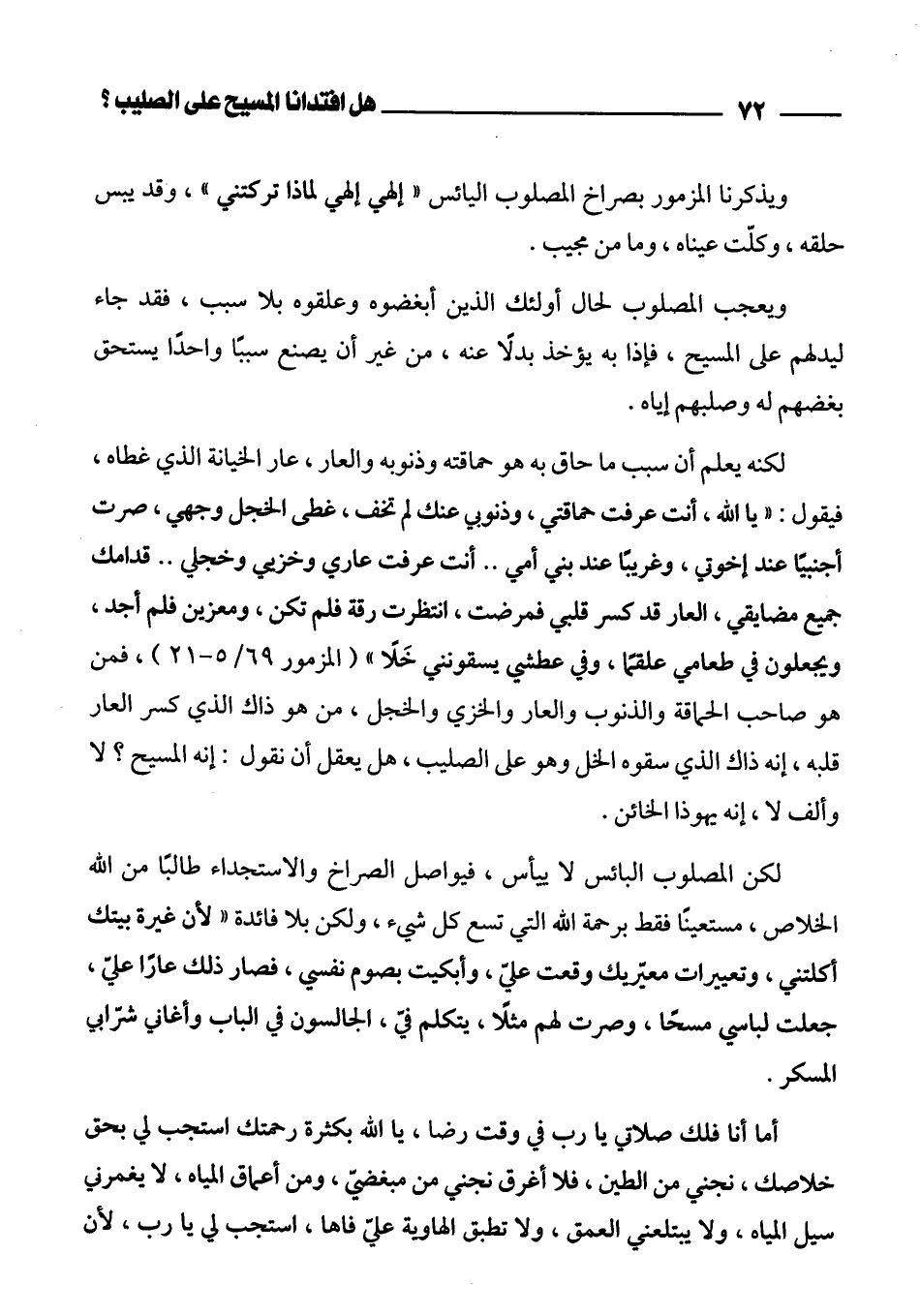 لكن المصلوب البائس لا ييأس، فيواصل الصراخ والاستجداء طالباً من الله الخلاص، مستعيناً فقط برحمة الله التي تسع كل شيء، ولكن بلا فائدة "لأن غيرة بيتك أكلتني، وتعييرات معيّريك وقعت عليّ، وأبكيت بصوم نفسي، فصار ذلك عاراً عليّ، جعلت لباسي مسحاً، وصرت لهم مثلاً، يتكلم فيّ، الجالسون في الباب وأغاني شرّابي المسكر.