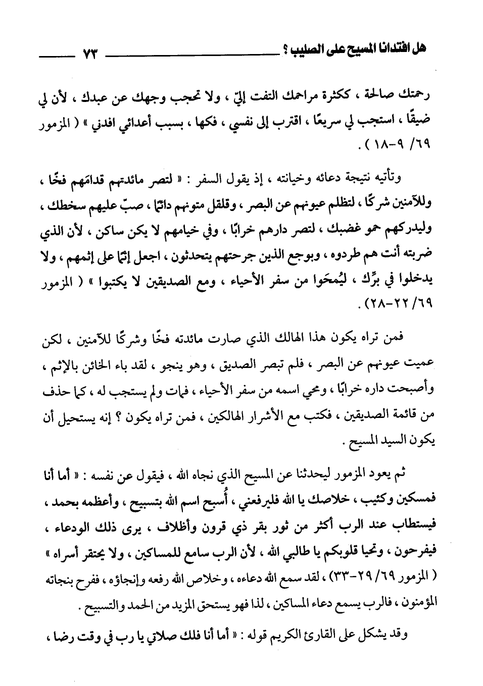 رحمتك صالحة، ككثرة مراحمك التفت إليّ، ولا تحجب وجهك عن عبدك، لأن لي ضيقاً، استجب لي سريعاً، اقترب إلى نفسي، فكها، بسبب أعدائي افدني" (المزمور 69/ 9 - 18).
