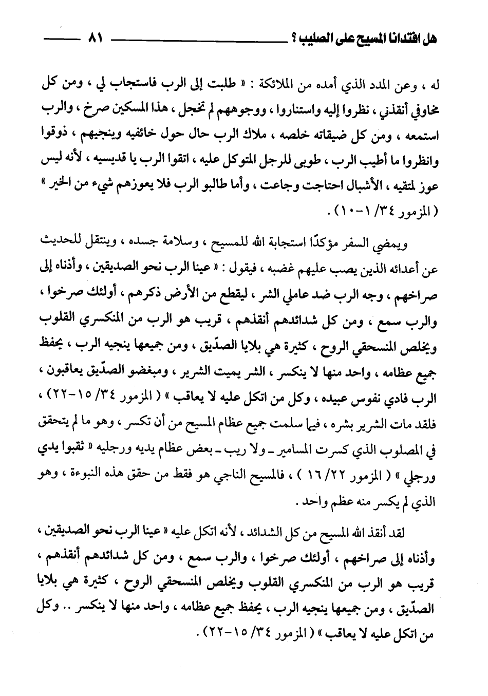 لقد أنقذ الله المسيح من كل الشدائد، لأنه اتكل عليه "عينا الرب نحو الصديقين، وأذناه إلى صراخهم، أولئك صرخوا، والرب سمع، ومن كل شدائدهم أنقذهم، قريب هو الرب من المنكسري القلوب ويخلص المنسحقي الروح، كثيرة هي بلايا الصدّيق، ومن جميعها ينجيه الرب، يحفظ جميع عظامه، واحد منها لا ينكسر .. وكل من اتكل عليه لا يعاقب" (المزمور 34/ 15 - 22).