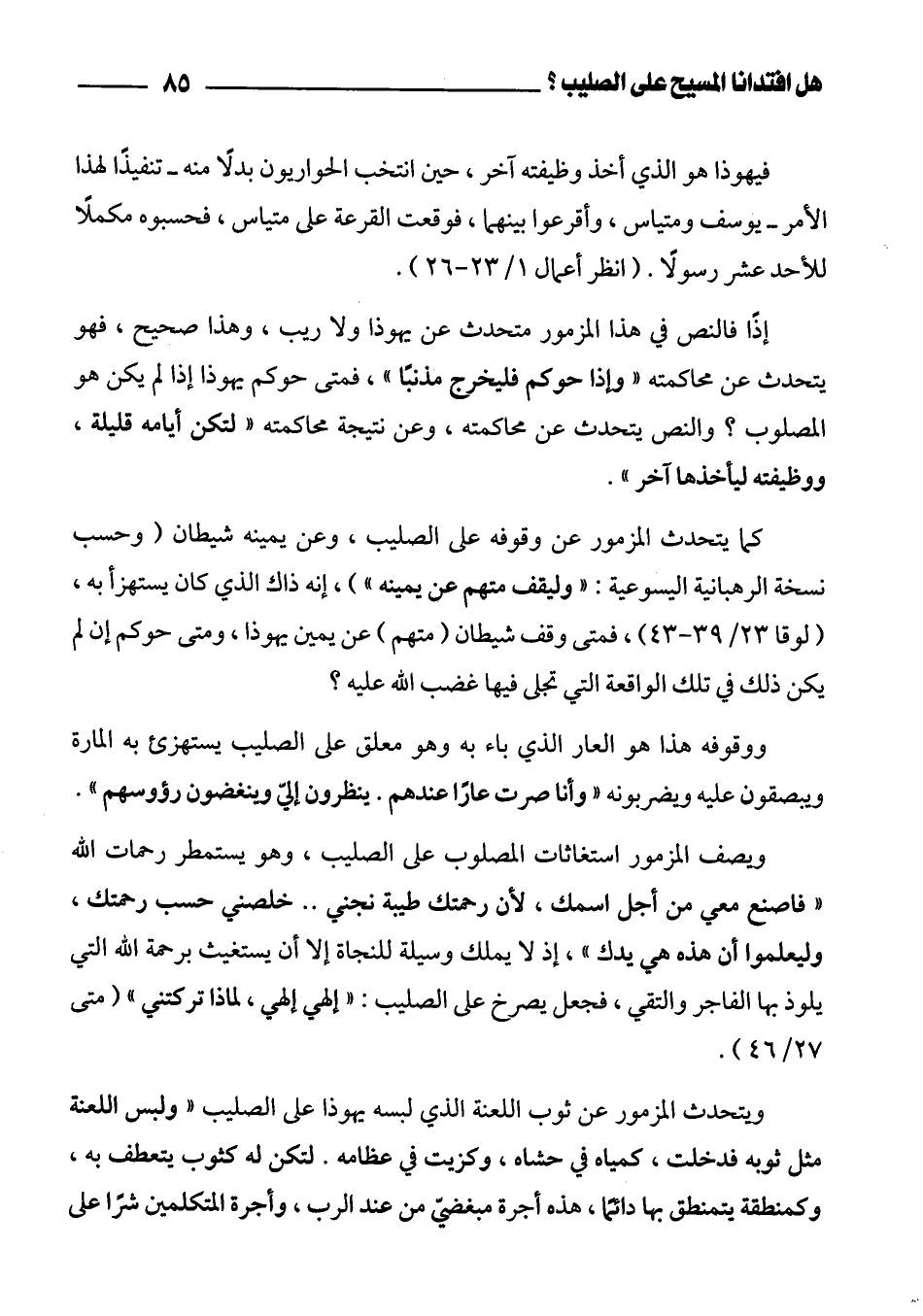 إذاً فالنص في هذا المزمور متحدث عن يهوذا ولا ريب، وهذا صحيح، فهو يتحدث عن محاكمته " وإذا حوكم فليخرج مذنباً "، فمتى حوكم يهوذا إذا لم يكن هو المصلوب؟ والنص يتحدث عن محاكمته، وعن نتيجة محاكمته " لتكن أيامه قليلة، ووظيفته ليأخذها آخر ".