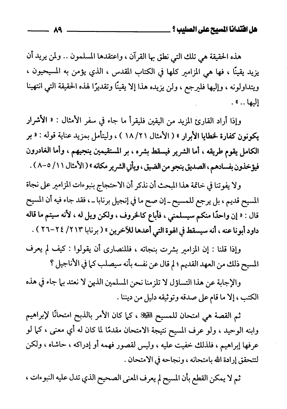 هذه الحقيقة هي تلك التي نطق بها القرآن، واعتقدها المسلمون ... ولمن يريد أن يزيد يقيناً، فها هي المزامير كلها في الكتاب المقدس، الذي يؤمن به المسيحيون، ويتداولونه، وإليها فليرجع، ولن يزيده هذا إلا يقيناً وتقديراً لهذه الحقيقة التي انتهينا إليها .. ".