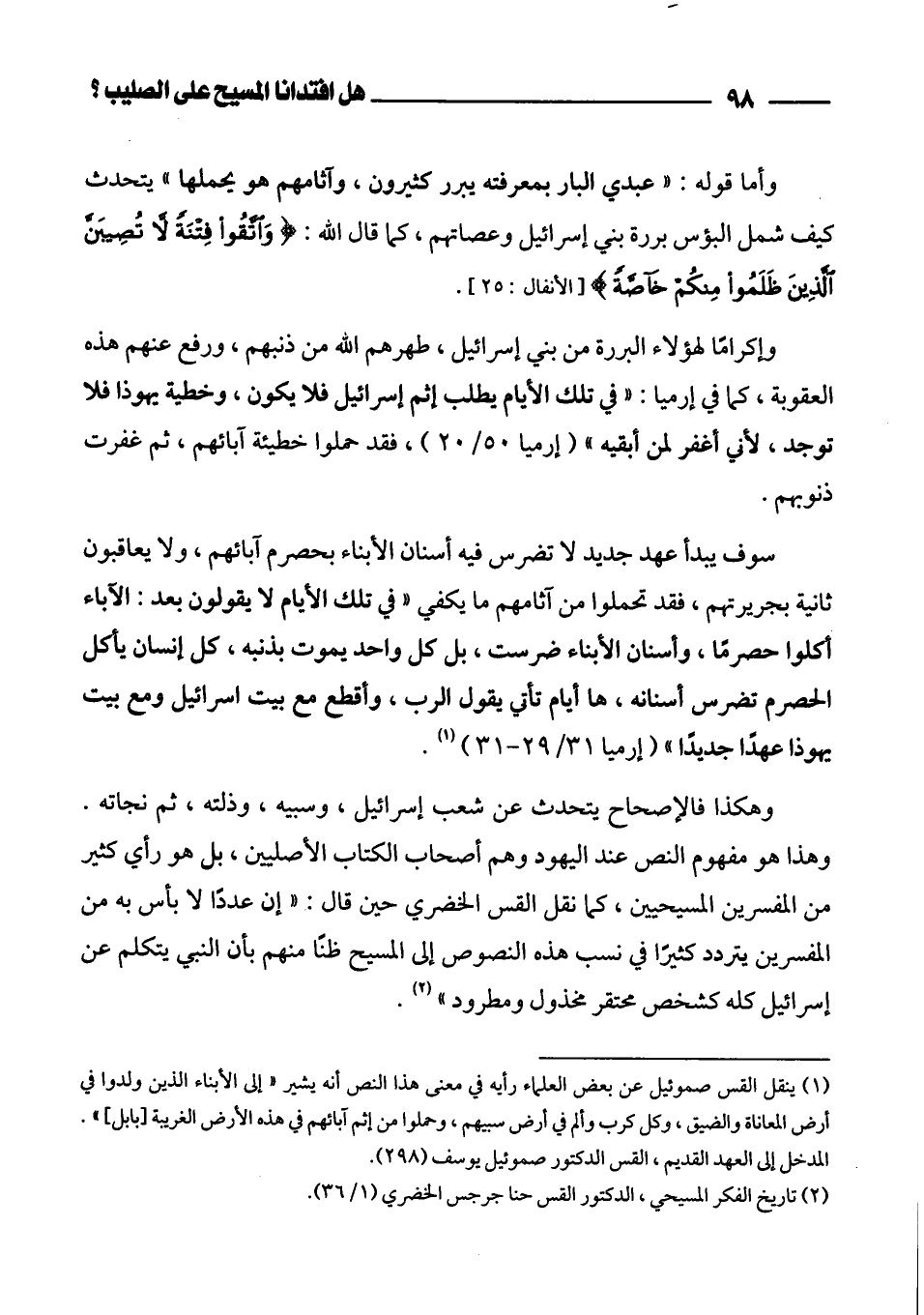 وهكذا فالإصحاح يتحدث عن شعب إسرائيل، وسبيه، وذلته، ثم نجاته. وهذا هو مفهوم النص عند اليهود وهم أصحاب الكتاب الأصليين، بل هو رأي كثير من المفسرين المسيحيين، كما نقل القس الخضري حين قال: "إن عدداً لا بأس به من المفسرين يتردد كثيراً في نسب هذه النصوص إلى المسيح ظناً منهم بأن النبي يتكلم عن إسرائيل كله كشخص محتقر مخذول ومطرود". (¬2)