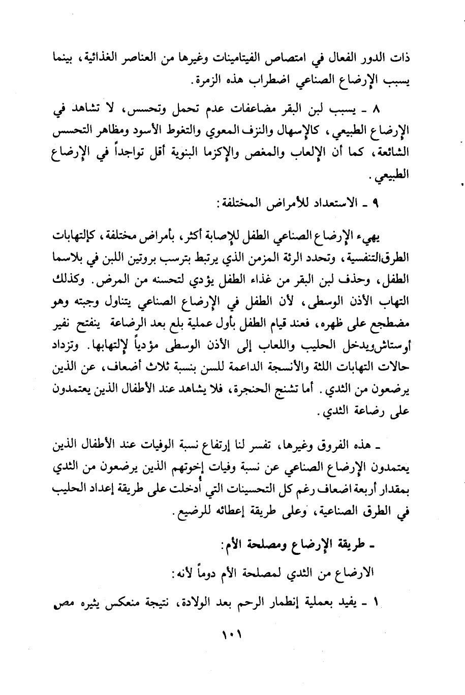 9 - الاستعداد للأمراض المختلفة: يهئ الارضاع الصناعي الطفل للإصابة أكثر، بأمراض مختلفة، كالتهابات الطرق التنفسية، وتحدد الرئة المزمن الذي يرتبط بترسب بروتين اللبن في بلاسما الطفل، وحذف لبن البقر من غذاء الطفل يودي لتحسنه من المرض. وكذلك التهاب الاذن الوسطى، لان الطفل في الارضاع الصناعي يتناول وجبته وهو مضطجع على ظهره، فعند قيام الطفل بأول عملية بلع بعد الرضاعة ينفتح نفير أوستاش ويدخل الحليب واللعاب إلى الاذن الوسطى مؤديا لالتهابها.
