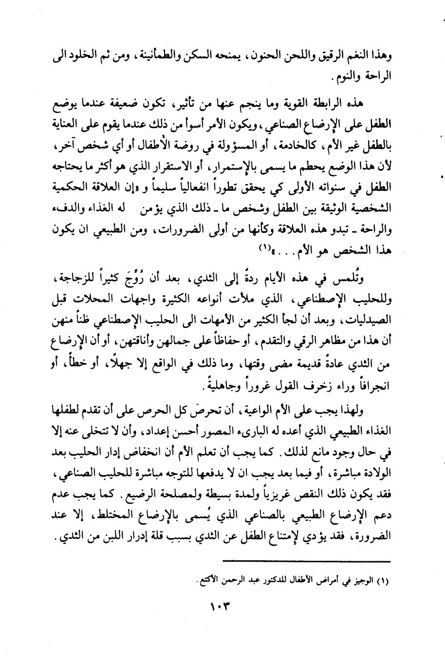 وتلمس في هذه الأيام ردة إلى الثدي، بعد أن روج كثيرا للزجاجة، وللحليب الاصطناعي، الذي ملأت أنواعه الكثيرة واجهات المحلات قبل الصيدليات، وبعد أن لجأ الكثير من الأمهات إلى الحليب الاصطناعي ظنا منهن أن هذا من مظاهر الرقي والتقدم، أو حفظا على جمالهن وأناقتهن، أو أن الارضاع من الثدي عادة قديمة مضى وقتها، وما ذلك في الواقع إلا جهلا، أو خطأ، أو انجرافا وراء زخرف القول غرورا وجاهلية.