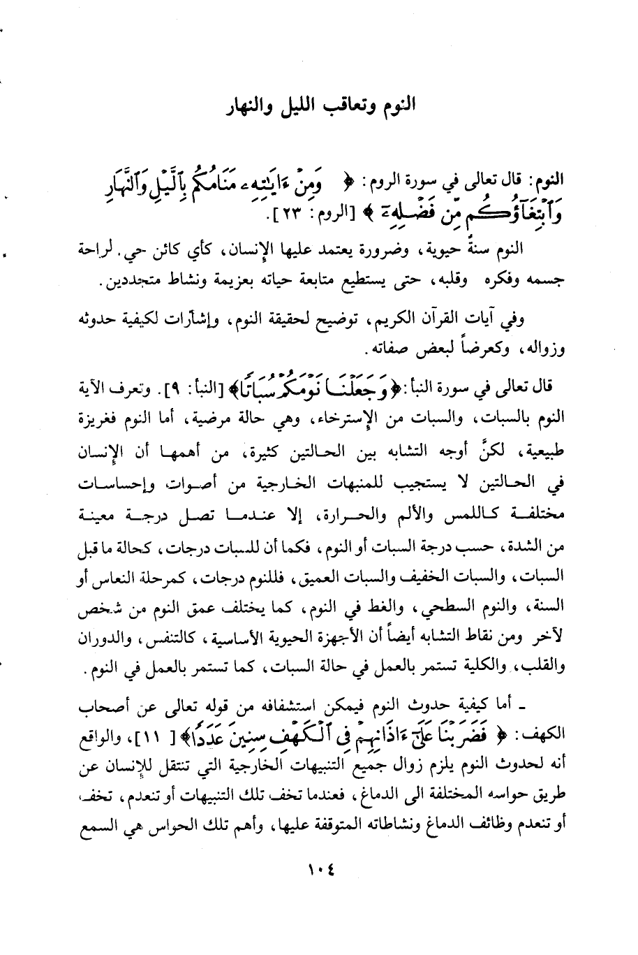 وفي آيات القرآن الكريم، توضيح لحقيقة النوم، وإشارات لكيفية حدوثه وزواله وكعرضا لبعض صفاته. قال تعالى في سورة النبأ: (وجعلنا نومكم سباتا) [النبأ: 9] وتعرف الآية النوم بالسبات، والسبات من الاسترخاء، وهي حالة مرضية، أما النوم فغريزة طبيعية، لكن أوجه التشابه بين الحالتين كثيرة، من أهمها أن الانسان في الحالتين لا يستجيب للمنبهات الخارجية من أصوات وإحساسات مختلفة كاللمس والألم والحرارة، إلا عندما تصل درجة معينة من الشدة، حسب درجة السبات أو النوم، فكما أن للسبات درجات، كحالة ما قبل السبات، والسبات الخفيف والسبات العميق، فللنوم درجات: كمرحلة النعاس أو السنة، والنوم السطحي، والغط في النوم، كما يختلف عمق النوم من شخص لآخر ومن نقاط التشابه أيضا أن الأجهزة الحيوية الأساسية، كالتنفس، والدوران والقلب، والكلية تستمر بالعمل في حالة السبات، كما تستمر بالعمل في النوم. - أما كيفية حدوث النوم فيمكن استشفافه من قوله تعالى من أصحاب الكهف: (فضربنا على آذانهم في الكهف سنين عددا) [11]