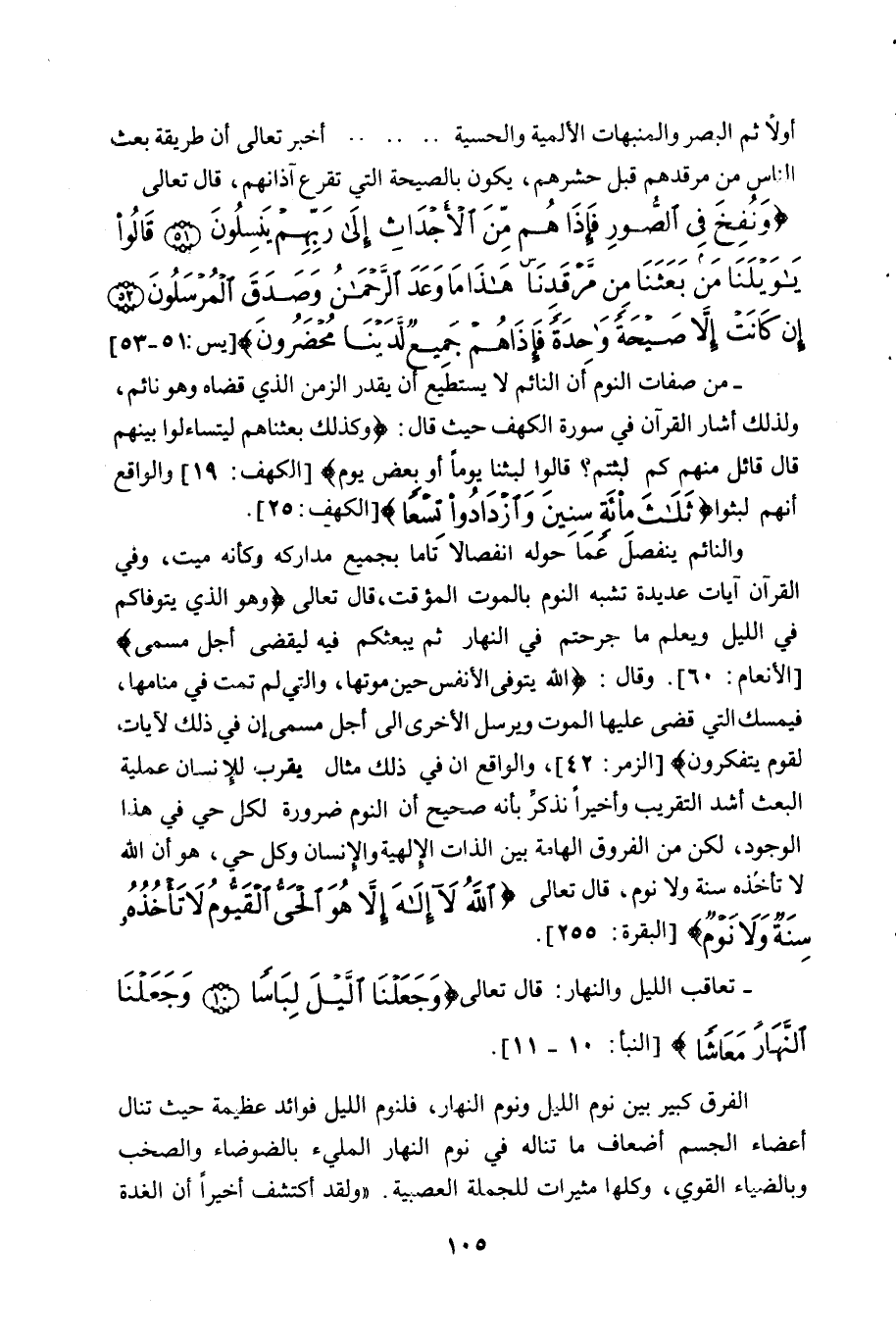 والواقع ان في ذلك مثال يقر للانسان عملية البعث أشد التقريب وأخيرا نذكر بأنه صحيح أن النوم ضرورة لكل حي، هو أن الله لا تأخذه سنة ولا نوم، قال تعالى (الله لا إله إلا الحي القيوم لا تأخذه سنة ولا نوم) [البقرة: 255] .