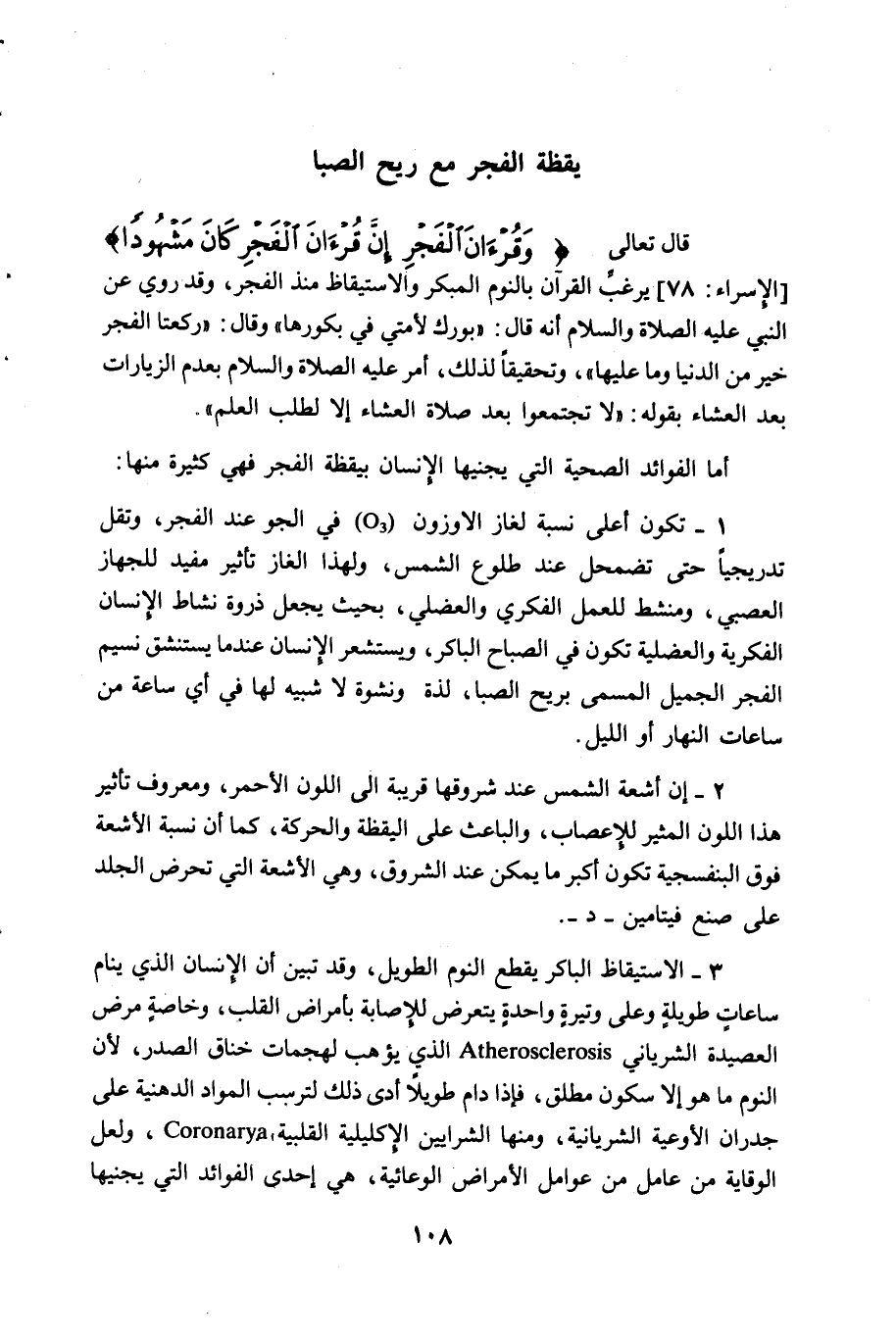 1 - تكون أعلى نسبة لغاز الأوزون (O 3) في الجو عند الفجر، وتقل تدريجيا حتى تضمحل عند طلوع الشمس، ولهذا الغاز تأثير مفيد للجهاز العصبي، ومنشط للعمل الفكري والعضلي، بحيث يجعل ذروة نشاط الانسان الفكرية والعضلية تكون في الصباح الباكر، ويستشعر الانسان عندما يستنشق نسيم الفجر الجميل المسمى بريح الصبا، لذة ونشوة لا شبيه لها في أي ساعة من ساعات النهار أو الليل.