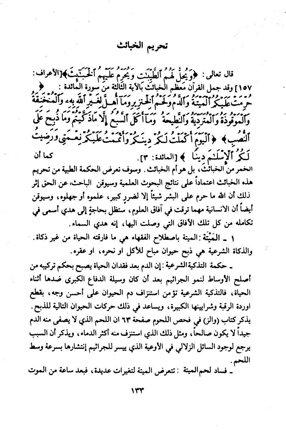 وقد جمل القرآن معظم الخبائث بالآية الثالثة من سورة المائدة: (حرمت عليكم الميتة والدم ولحم الخنزير وما أهل لغير الله به، والمنخنقة والموقوذة والمتردية والنطيحة وما أكل السبع إلا ما ذكيتم وما ذبح على النصب) (اليوم أكملت لكم دينكم وأتممت عليكم نعمتي ورضيت لكم الأسلم دينا) [المائدة: 3] .