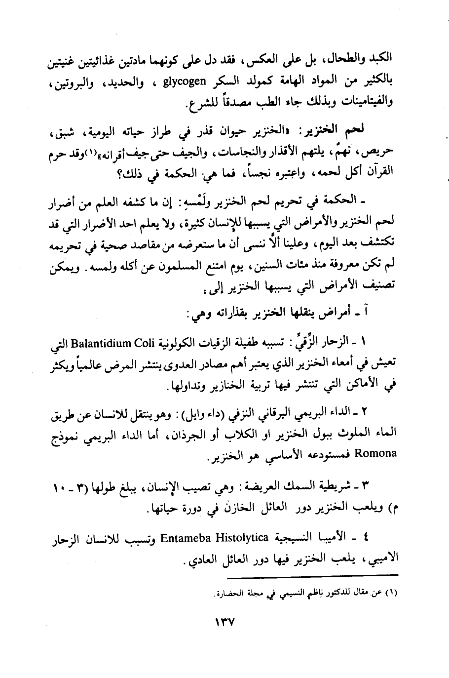 4 - الأميبيا النسيجية Entameba Histolyitca وتسبب للانسان الزحار الأميبي، يلعب الخنزير فيها دور العائل العادي.
