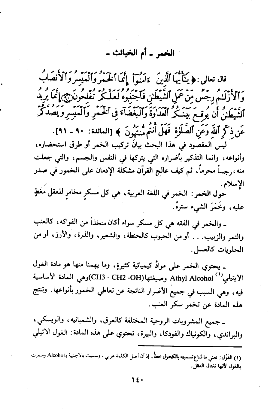 ليس المقصود في هذا البحث بيان تركيب الخمر أو طرق استحضاره، وأنواعه، وانما التذكير بأضراره التي يتركها في النفس والجسم، والتي جعلت منه، رجسا محرما، ثم كيف عالج القرآن مشكلة الادمان على الخمور في صدر الاسلام.