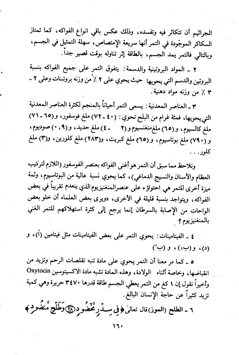 ونلاحظ مما سبق أن التمر هو أغنى الفواكه بعنصر الفوسفور (اللازم لتركيب العظام والأسنان والنسيج الدماغي) كما يحوي نسبة عالية من البوتاسيوم، وثمة ميزة أخرى للتمر هي احتواؤه على عنصر المغنيزيوم الذي ينعدم تقريبا في بعض الفواكه، ويتواجد بنسبة قليلة في الأخرى،