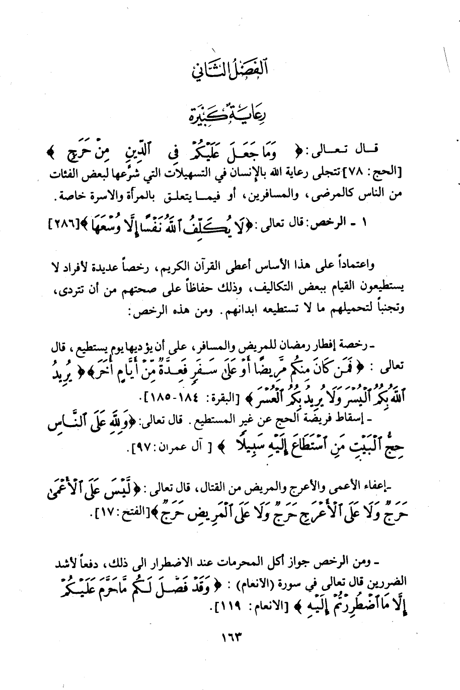 قال تعالى: (لا يكلف الله نفسا إلا وسعها) [286] واعتمادا على هذا الأساس أعطى القرآن الكريم، رخصا عديدة لافراد لا يستطيعون القيام ببعض التكاليف، وذلك حفاظا على صحتهم من أن تتردى. وتجنبا لتحميلهم مالا تستطيعه أبدانهم.