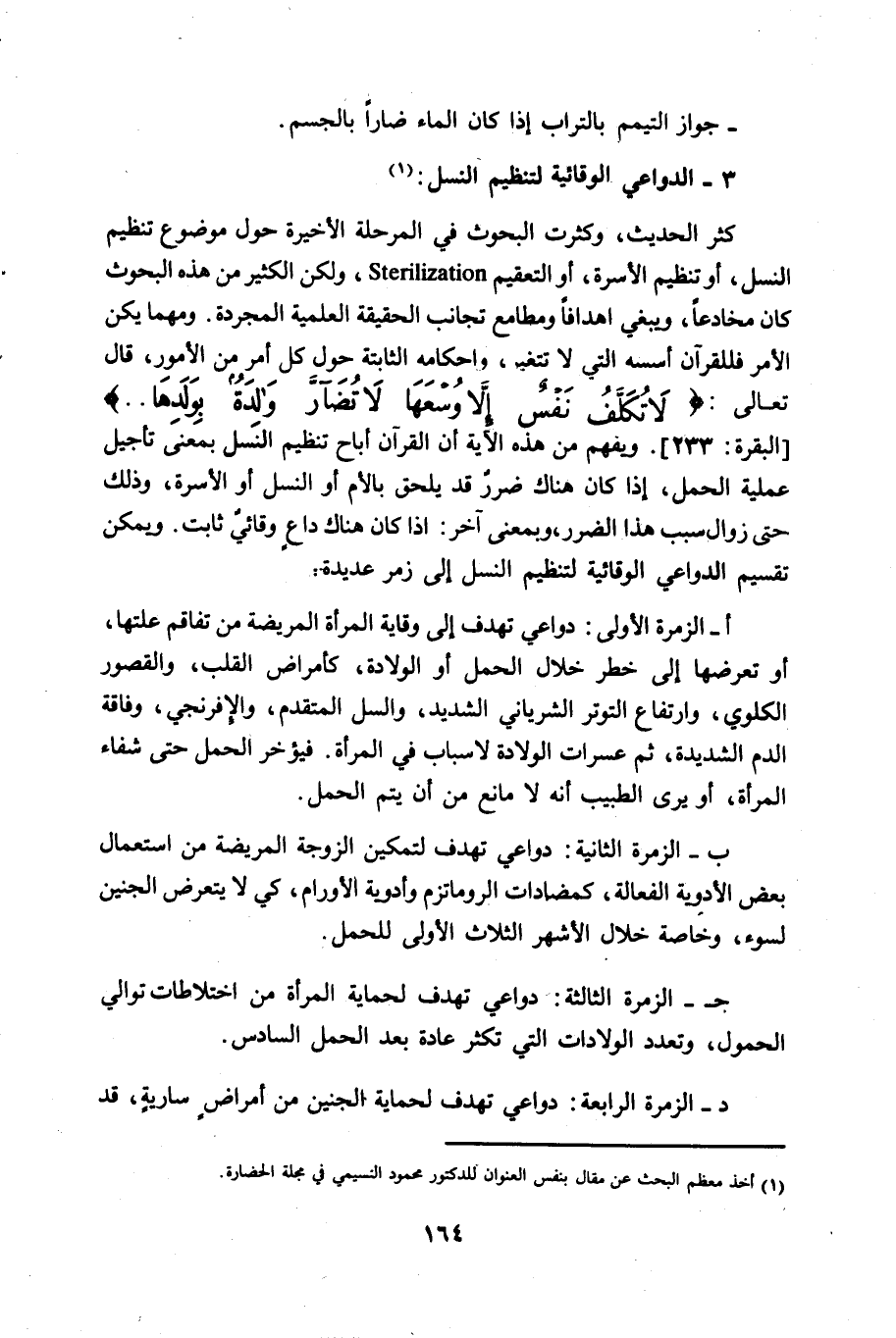 ويفهم من هذه الآية أن القرآن أباح تنظيم النسل بمعنى تأجيل عملية الحمل، إذا كان هناك ضرر قد يلحق بالام أو النسل أو الأسرة، وذلك حتى زوال سبب هذا الضرر، وبمعنى آخر: إذا كان هناك داع وقائي ثابت، ويمكن تقسيم الدواعي الوقائية لتنظيم النسل إلى زمر عديدة:
